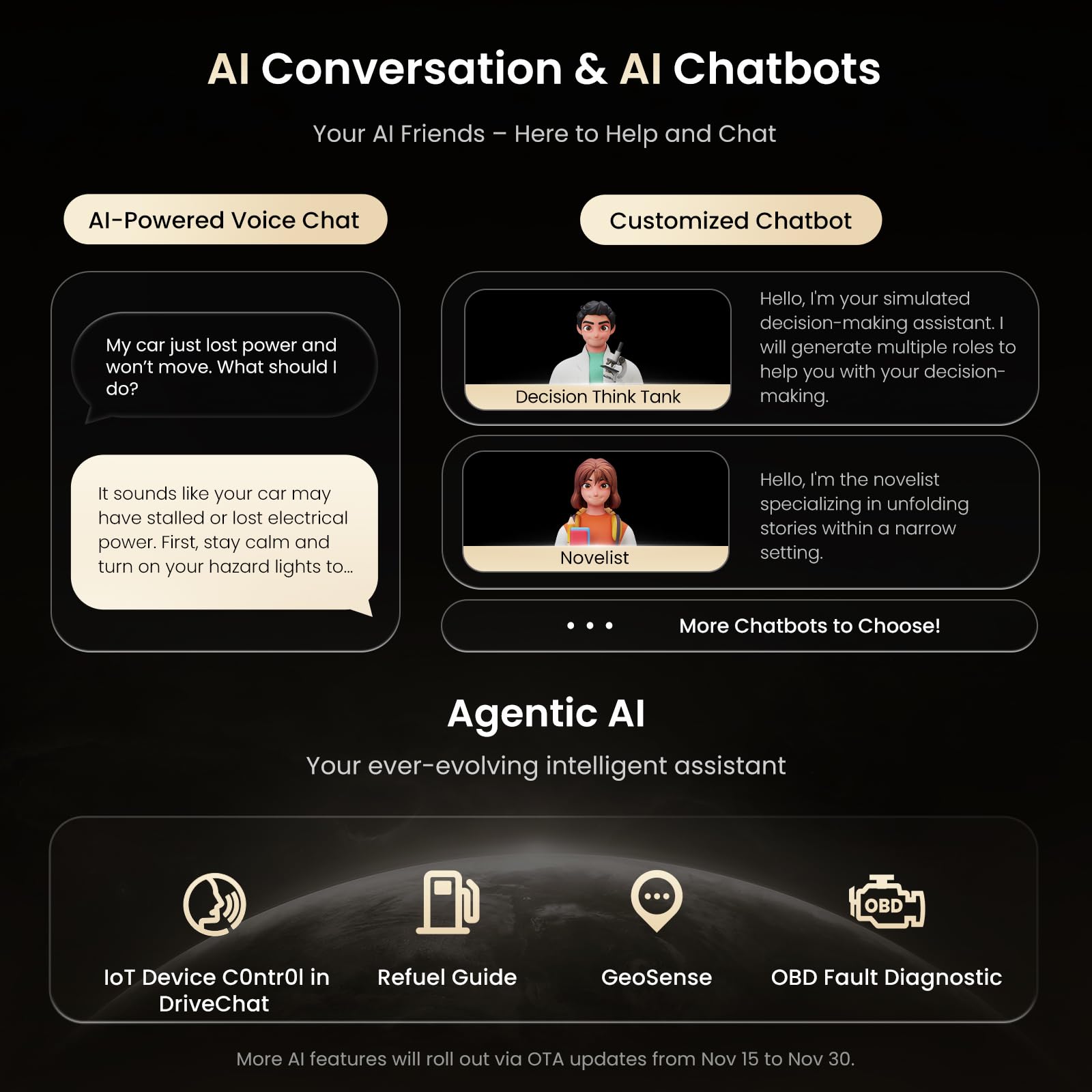 - 【AI Chat & Vehicle Tracking】DriveChat AI (Powered by ChatGPT 5.2 and Gemini 3.0) provides real-time conversational support, answering questions and keeping you engaged on the road. With TrackHU GPS tracking and customizable geofence alerts, you can stay informed of your vehicle's location at all times. This combination of in-car assistance and continuous location awareness offers added confidence for daily drivers and families.