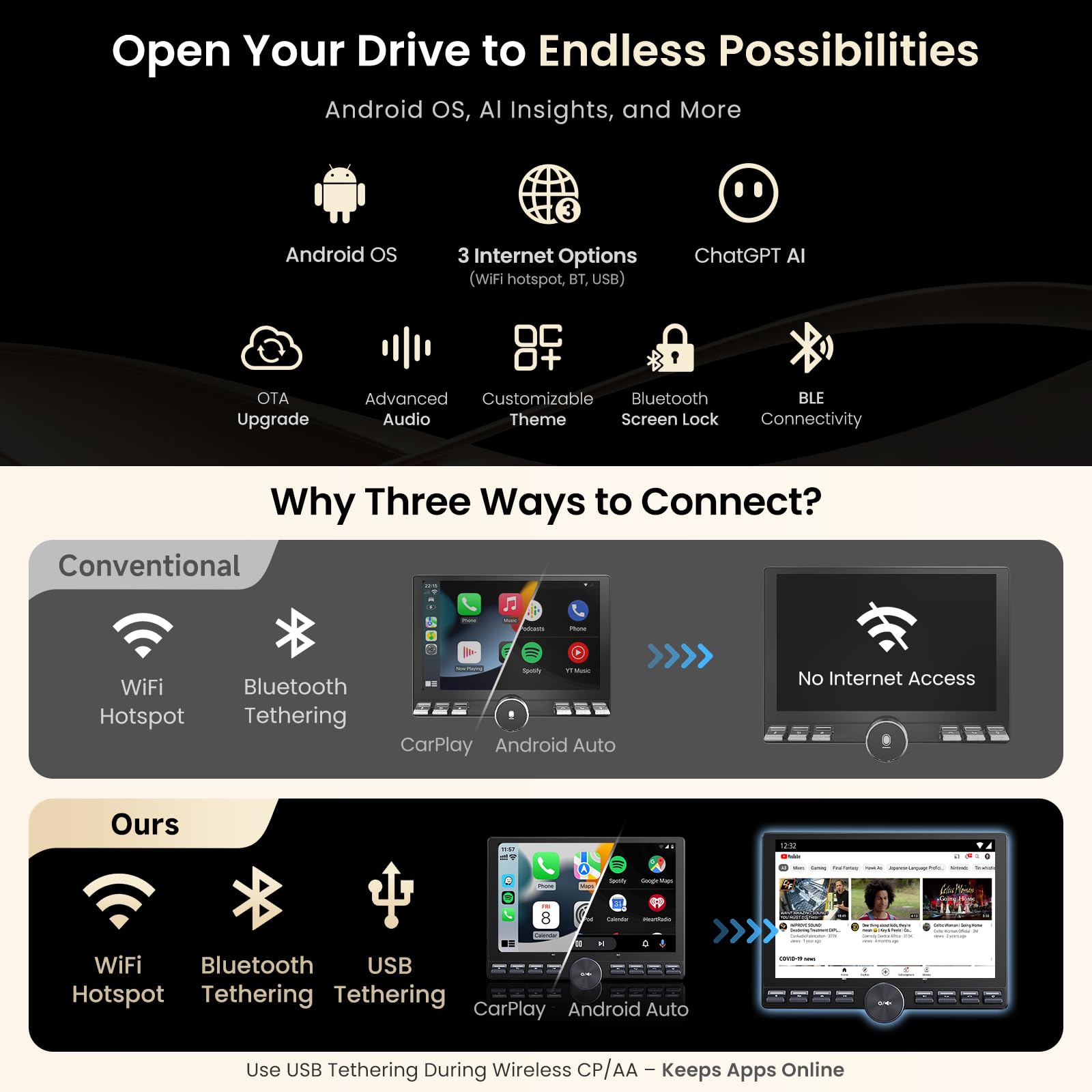 - 【3 Ways to Stay Connected】Enjoy flexible connectivity with three network options. Establish a stable, high-speed link through the USB port. Connect to Wi-Fi for efficient data usage and updates. Bluetooth remains available as a reliable connection method for navigation and audio streaming. Please note: Wi-Fi connectivity is not available during wireless CarPlay or Android Auto operation.